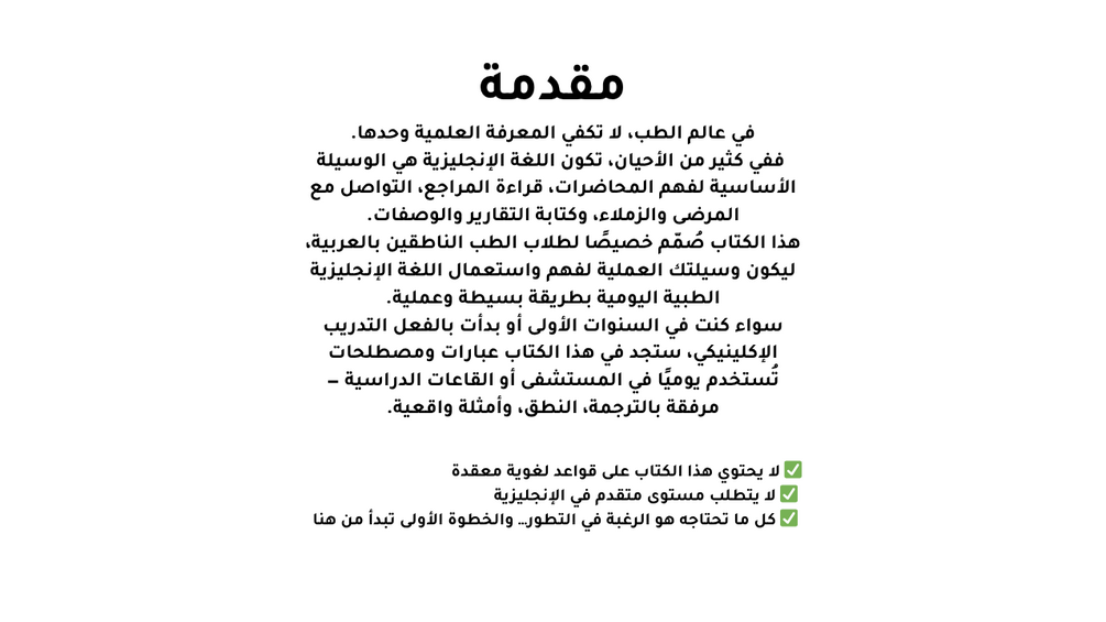 دليل مبسط لتعلّم الإنجليزية الطبية لطلاب الطب، يشمل مفردات أساسية، عبارات واقعية، وتمارين خفيفة — مثالي للمبتدئين.